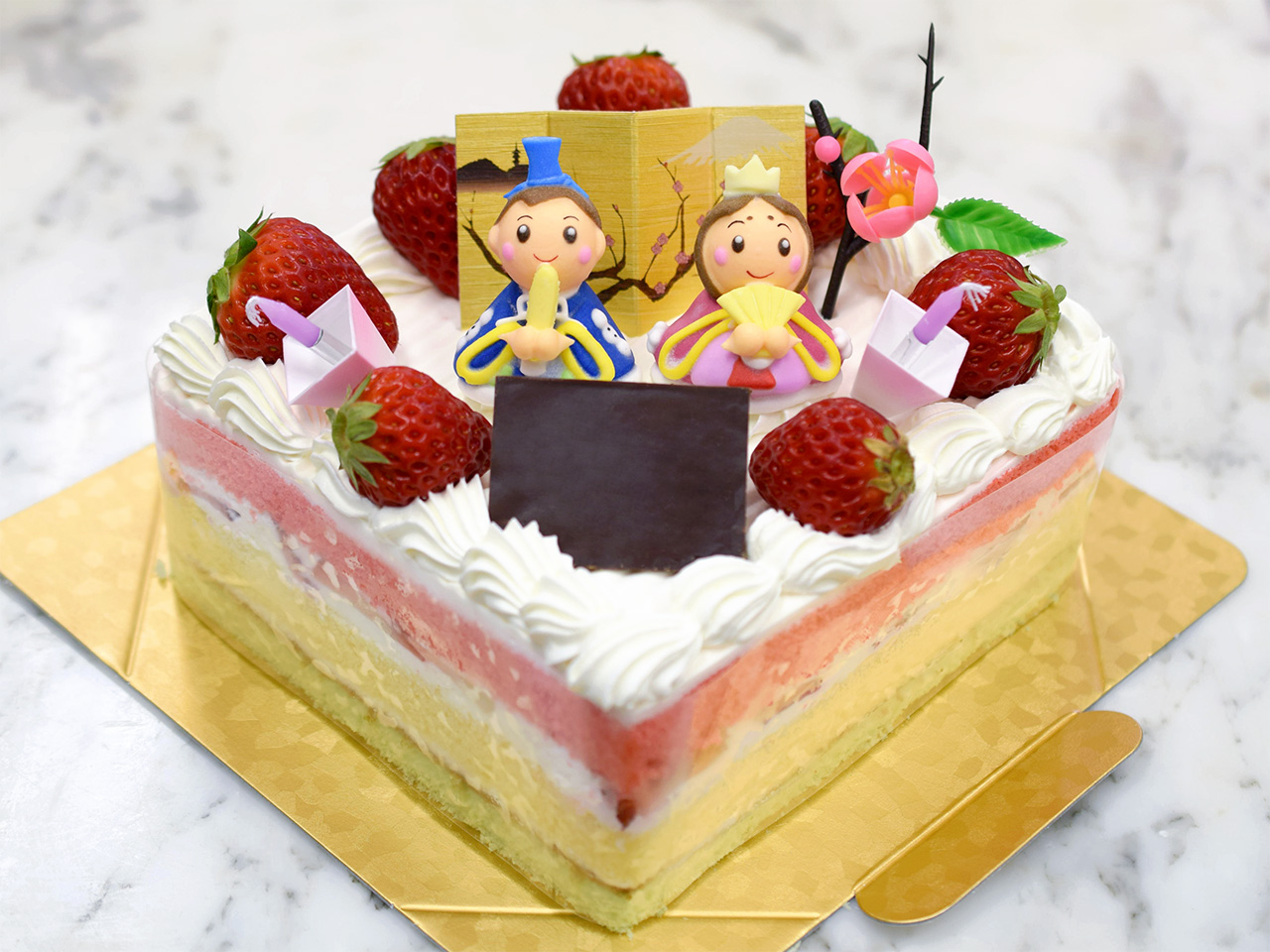ひな祭りスペシャルケーキ Home 商品情報 2026年ひな祭りのケーキ 商品カテゴリー イベント商品 販売状況 ご予約商品 商品名 ひな祭りスペシャルケーキ 商品説明 ひし餅をイメージした三色のスポンジで作りました。 中に苺をサンド。 お人形、桃の花、ぼんぼりロウソク×2の他に、お子様のお名前もお入れいたします。 サイズ 15cm × 15cm 商品価格 3,900円 (税別 3,611円) ※デコレーション箱に入れてのお渡しになります。 ※デザインが変更となる場合があります。